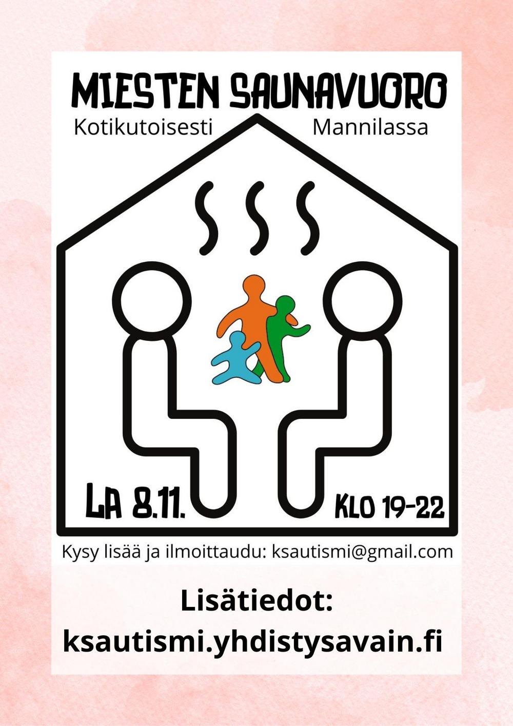 Paikka: Perusrivarikodin perussähkösauna Mannilassa, osoitteen saat ilmoittautuessasi sähköpostilla ksautismi(at)gmail.com