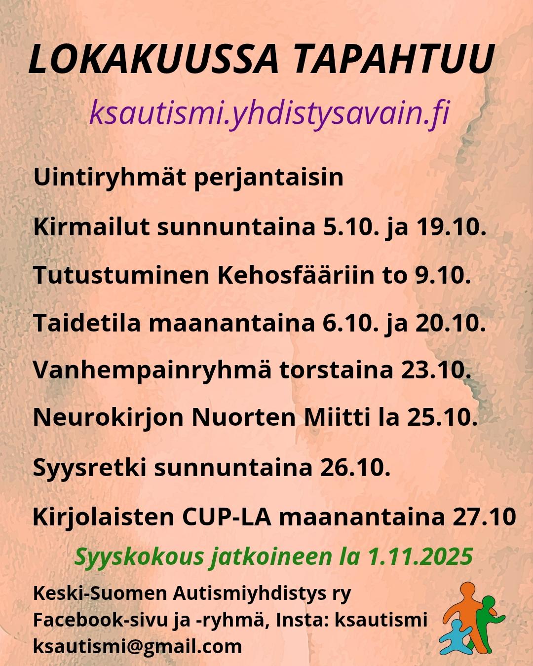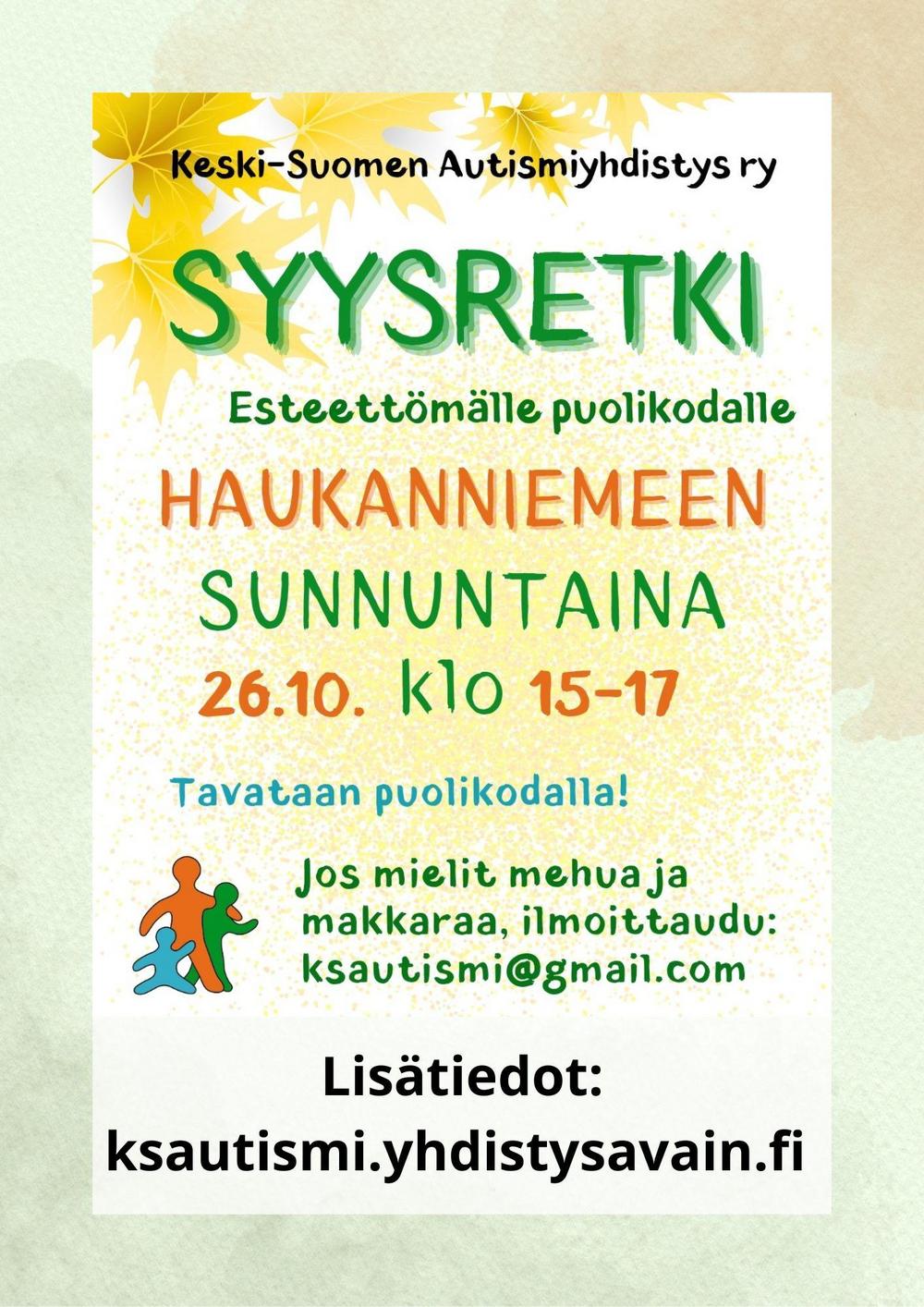 Lisää infoa tulee Keski-Suomen Autismiyhdistyksen Facebook-sivun tapahtumaan, jossa myös ilmoitetaan mahdolliset muutokset, tai peruuntuminen.