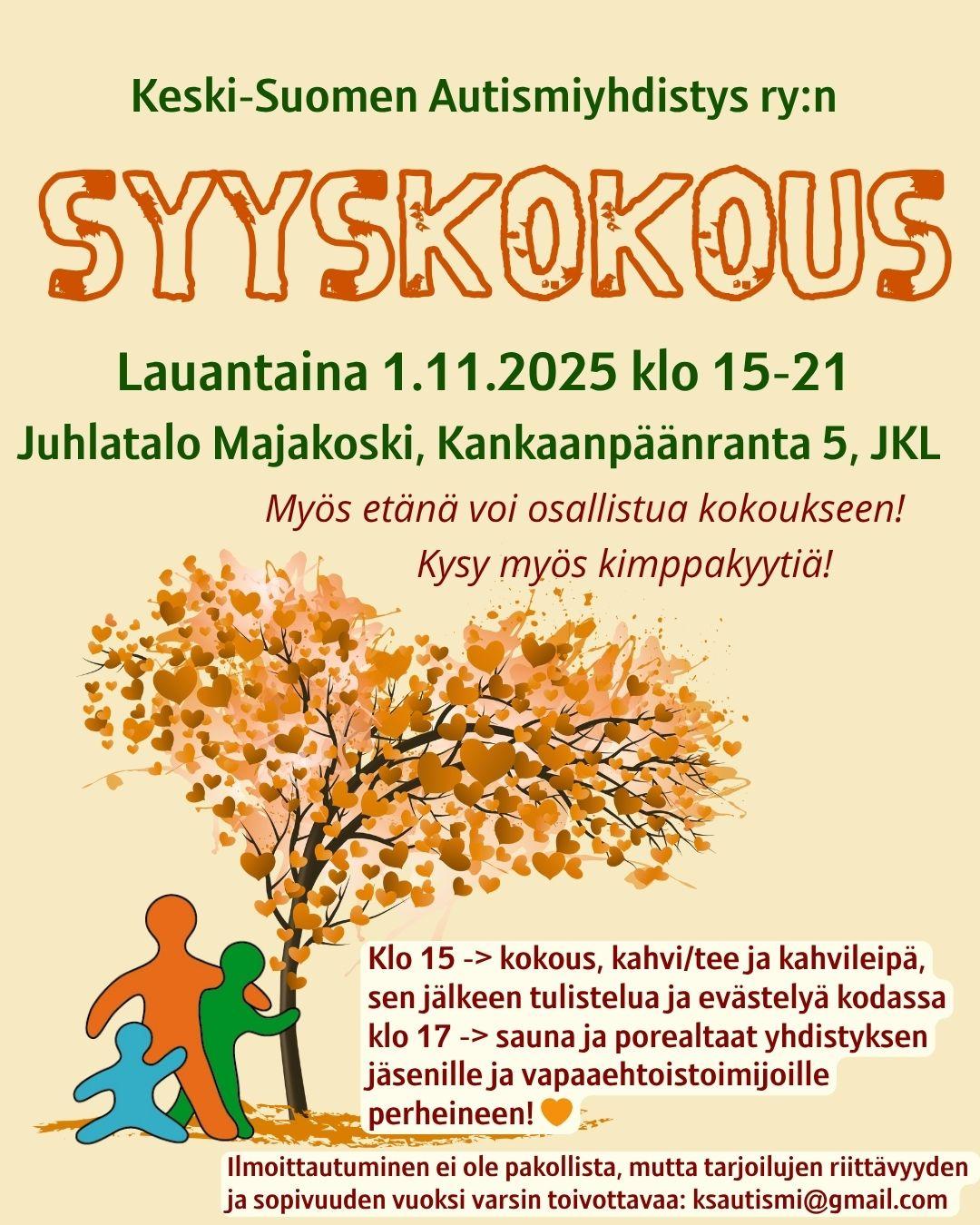 Lisää infoa tulee Keski-Suomen Autismiyhdistyksen Facebook-sivun tapahtumaan, jossa myös ilmoitetaan mahdolliset muutokset, tai peruuntuminen.
